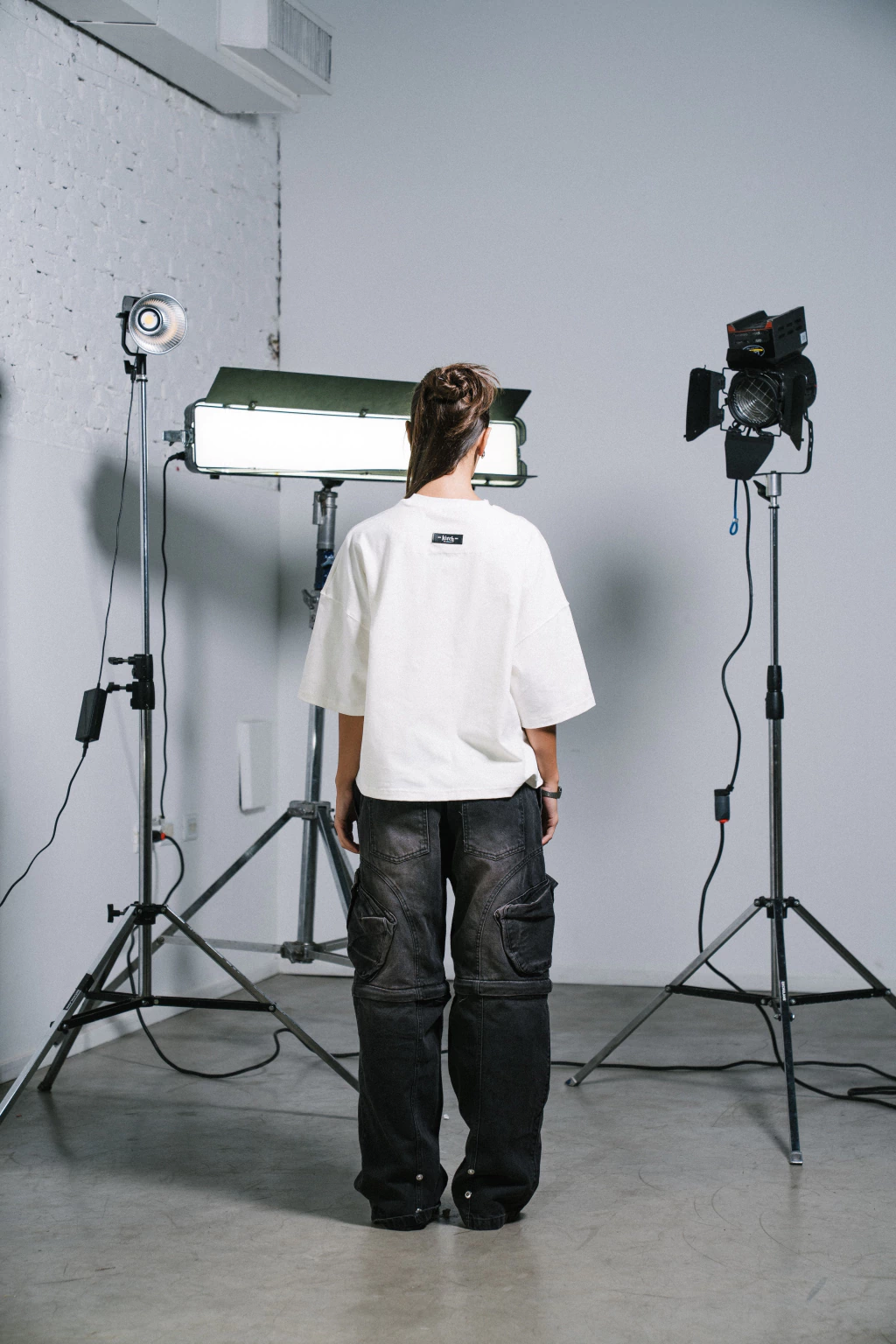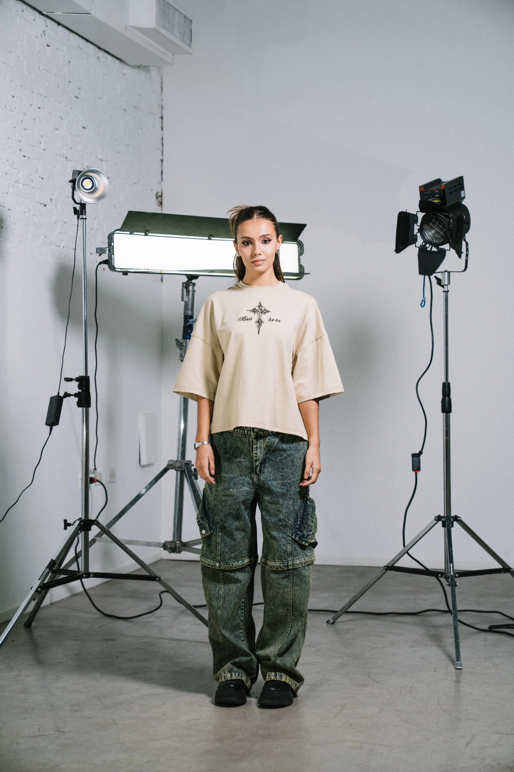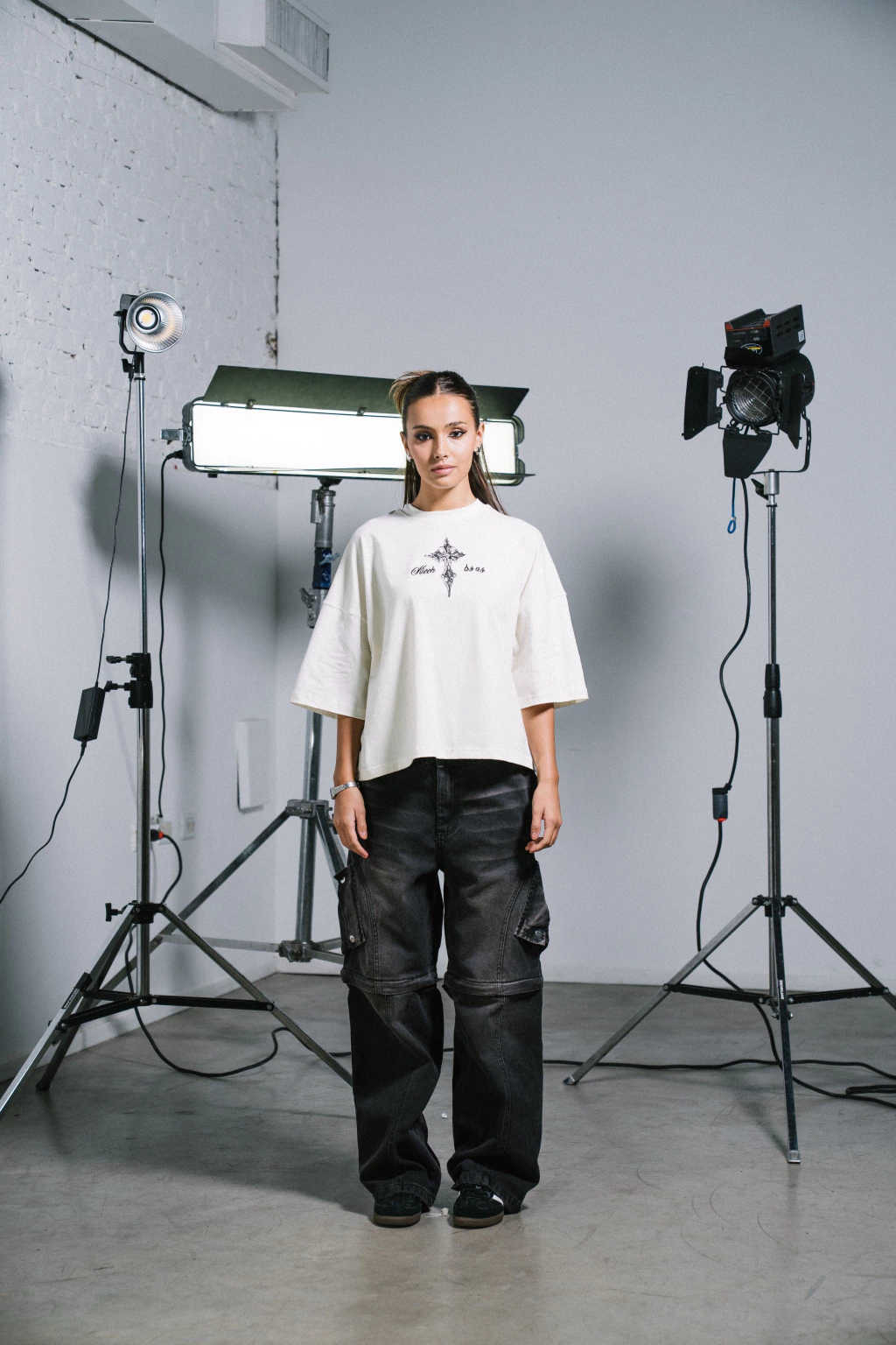 Remera Aura de algodon con lycra de corte semi boxy con estampa minimalista de una cruz y 2 bordados de "kiech" y "BSAS"