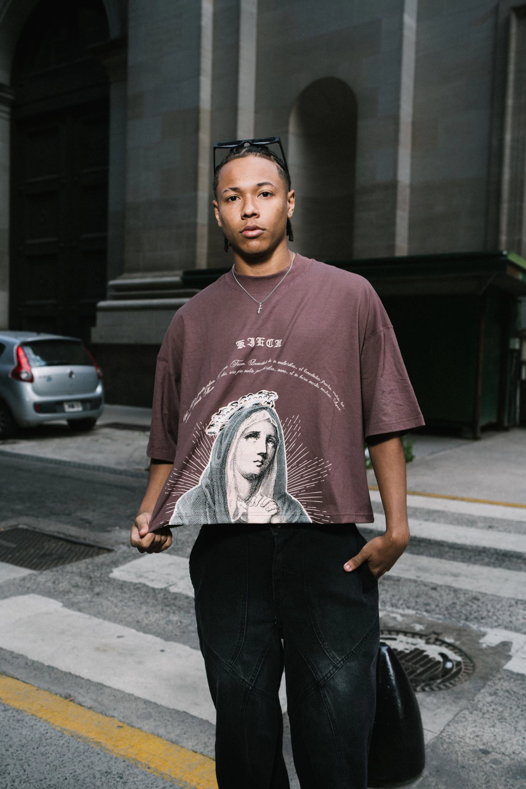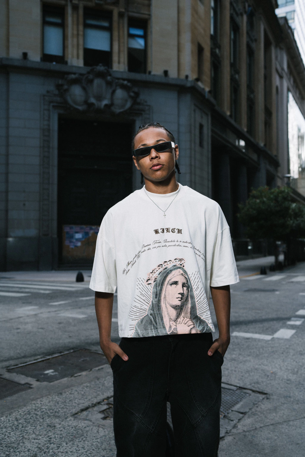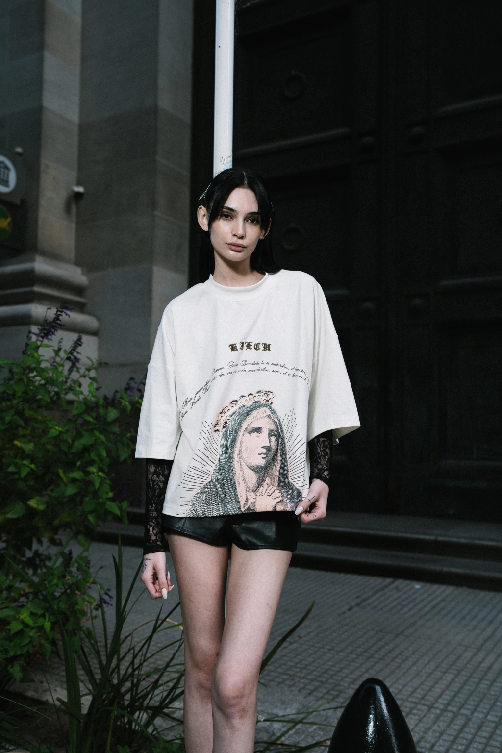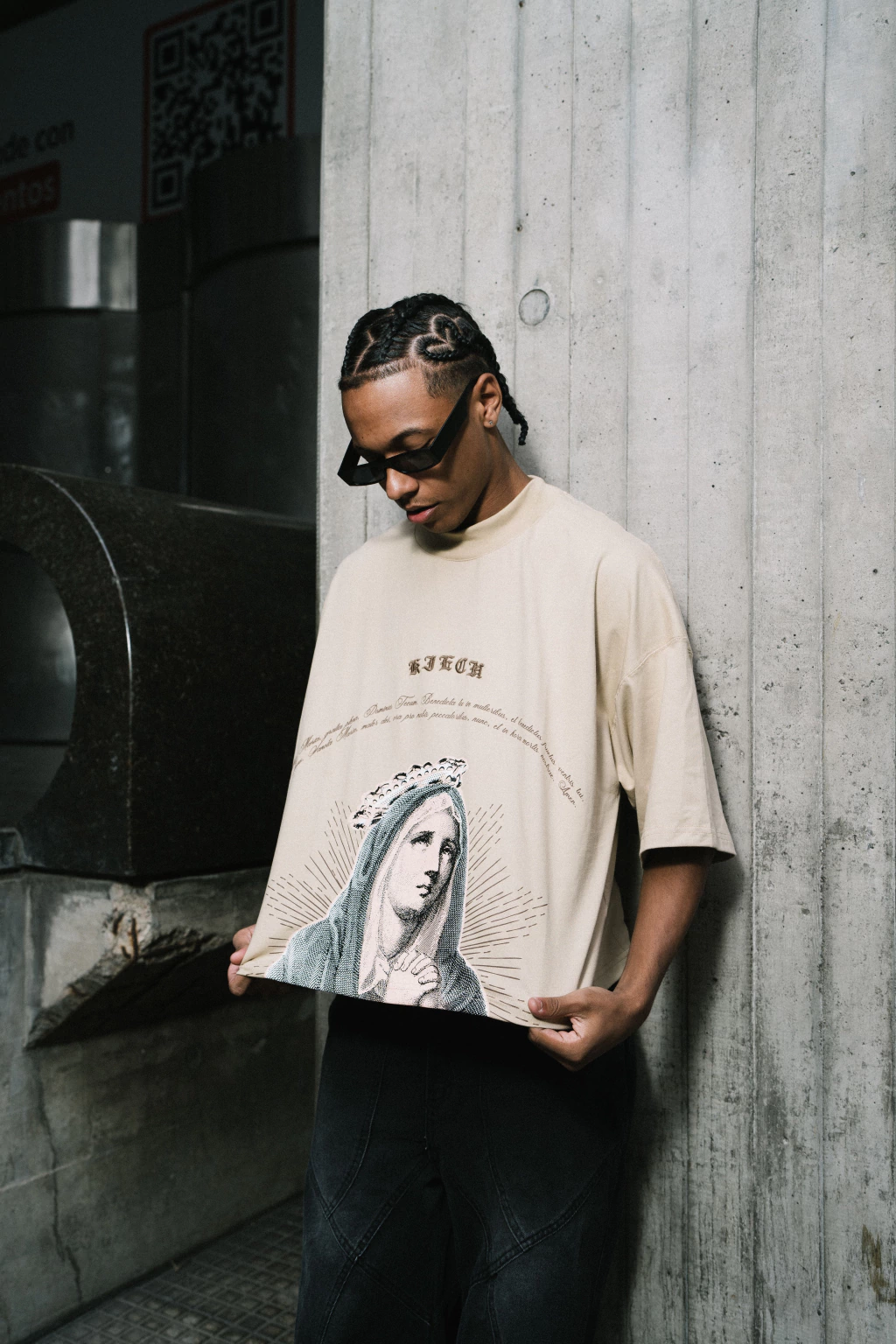 Remera Sanctus semiboxy de algodon con lycra pesado de verano con cuello de ribb alto, estampa de la virgen en el delantero y logo "KIECH" bordado.