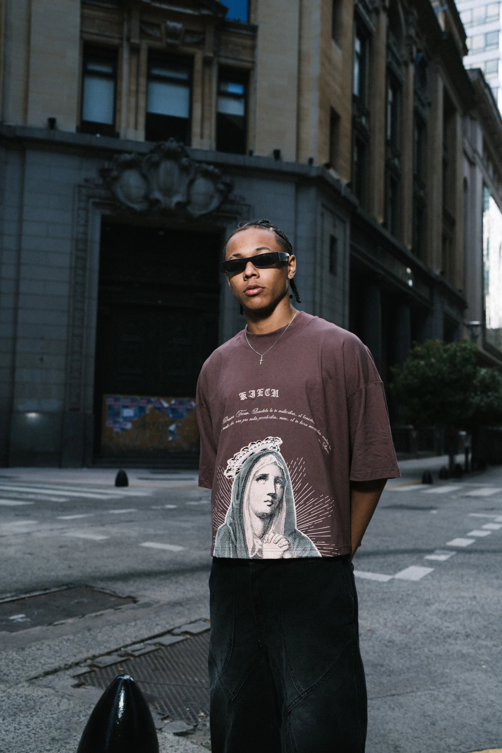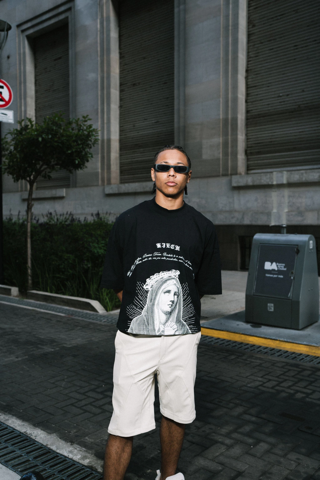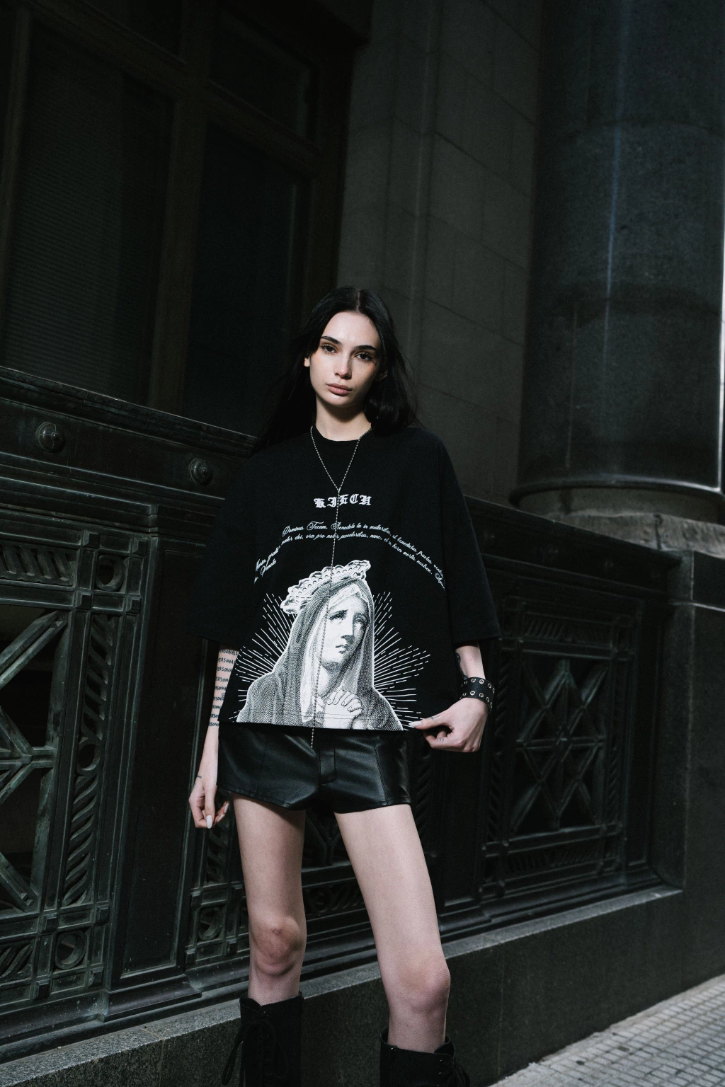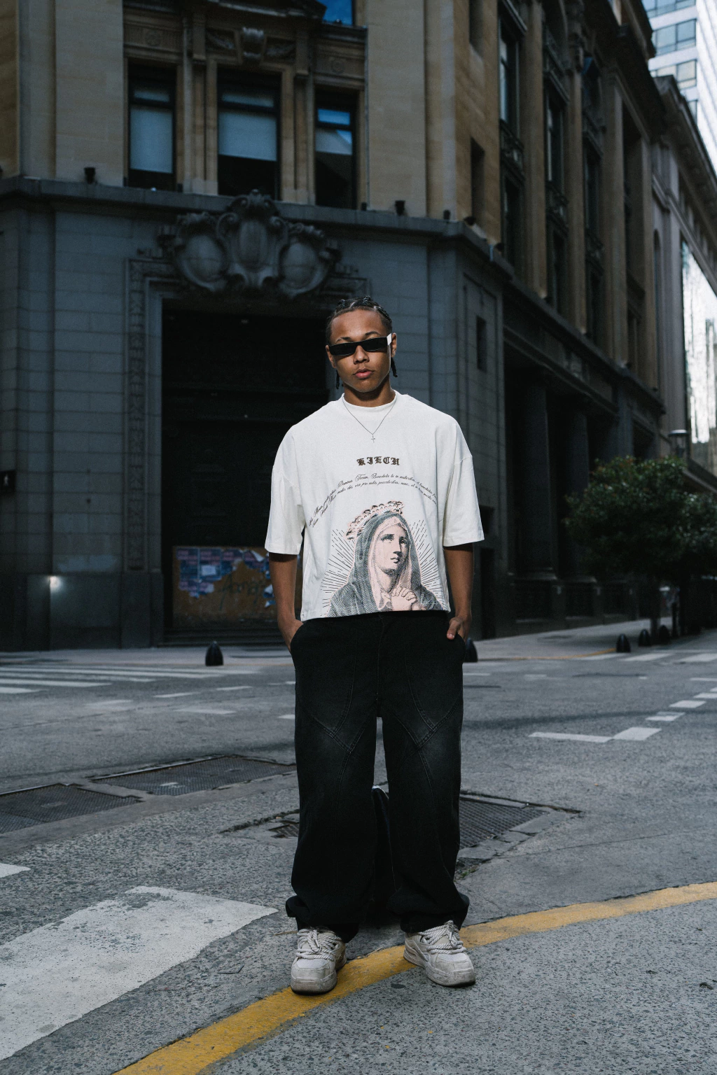 Remera Sanctus semiboxy de algodon con lycra pesado de verano con cuello de ribb alto, estampa de la virgen en el delantero y logo "KIECH" bordado.
