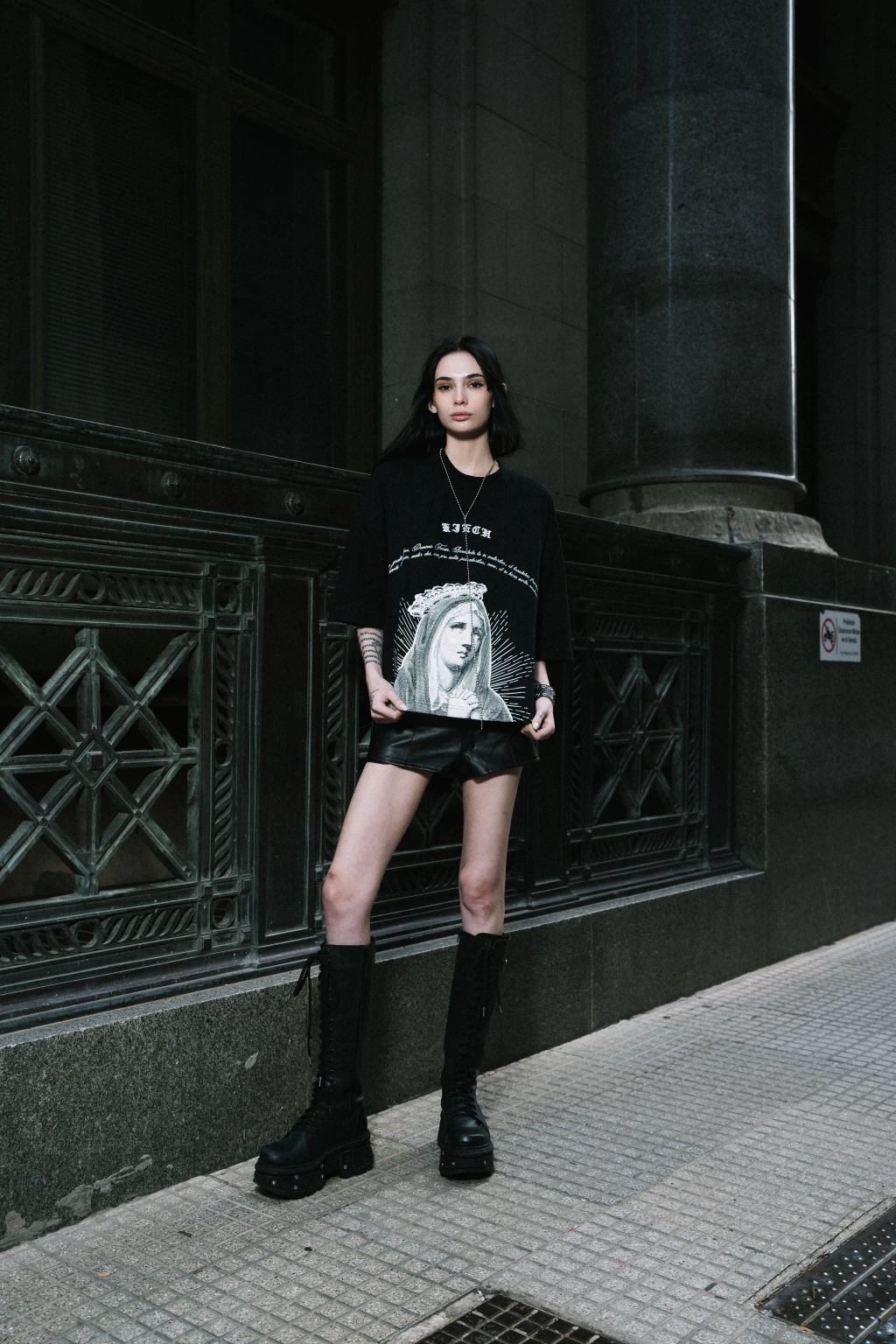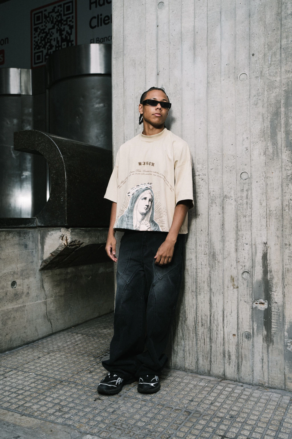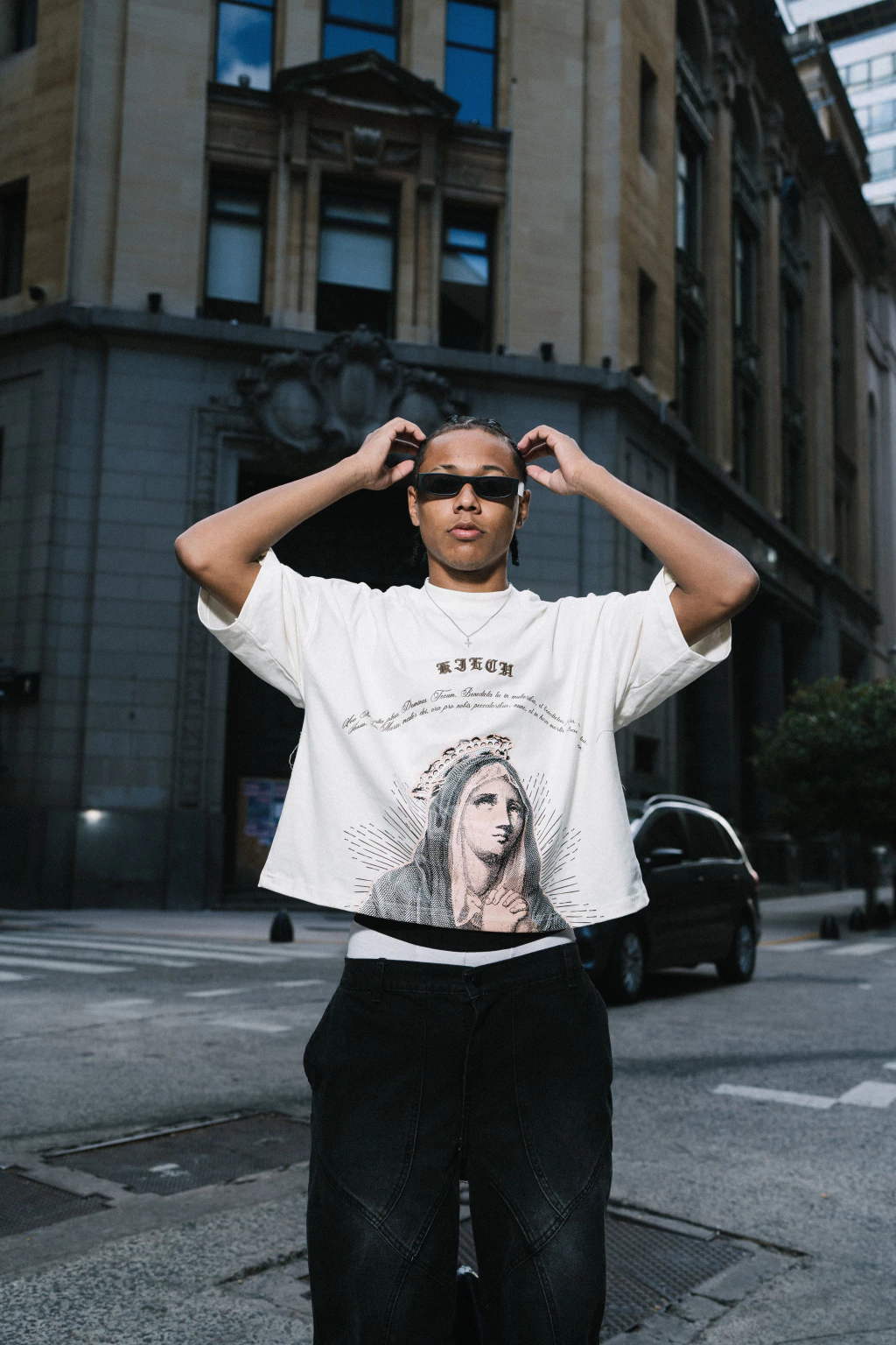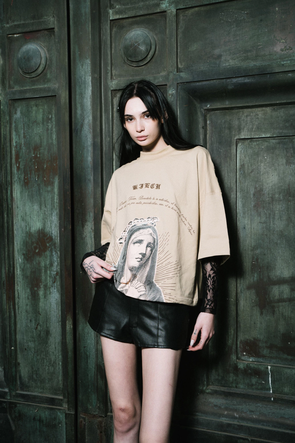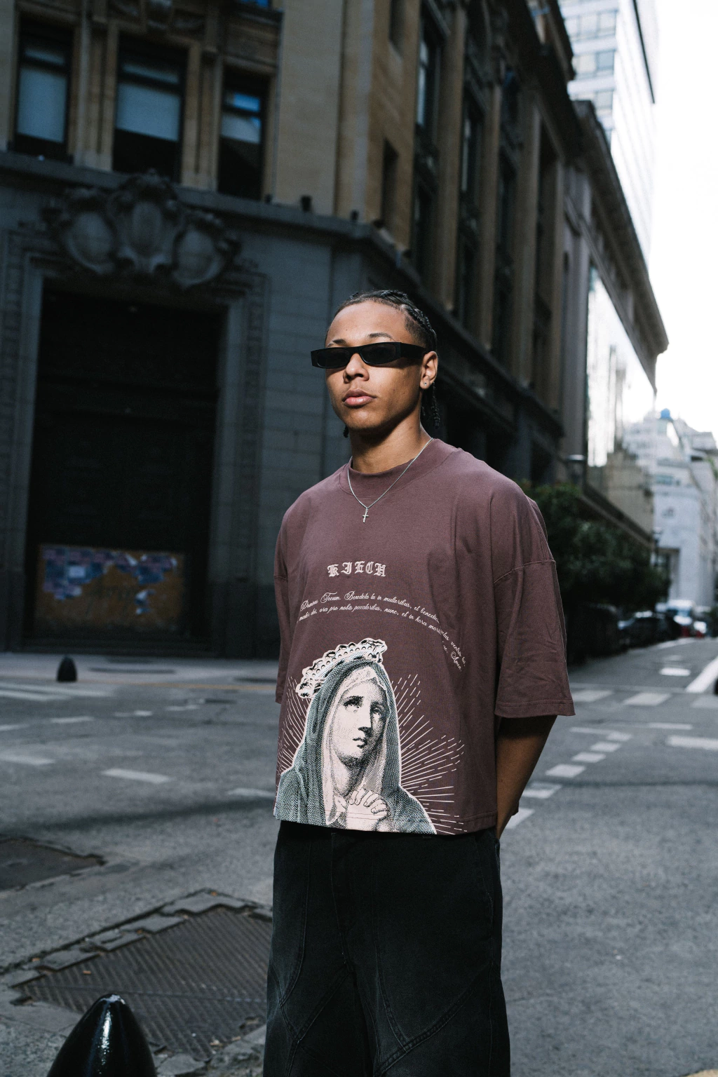 Remera Sanctus semiboxy de algodon con lycra pesado de verano con cuello de ribb alto, estampa de la virgen en el delantero y logo "KIECH" bordado.