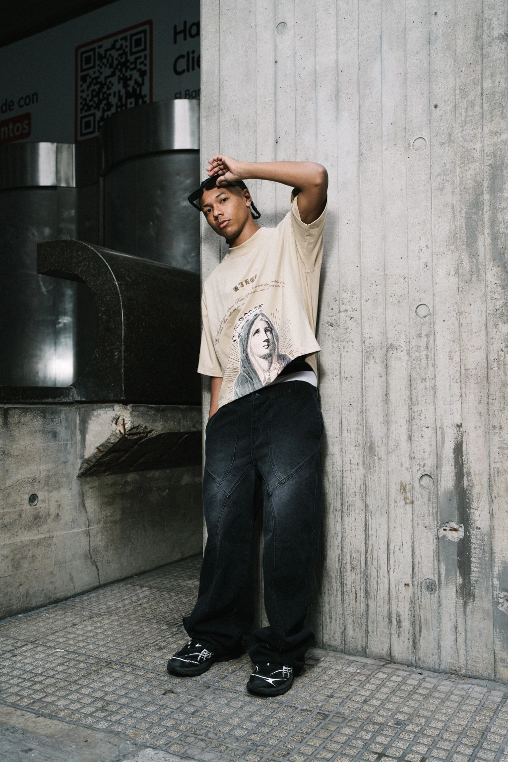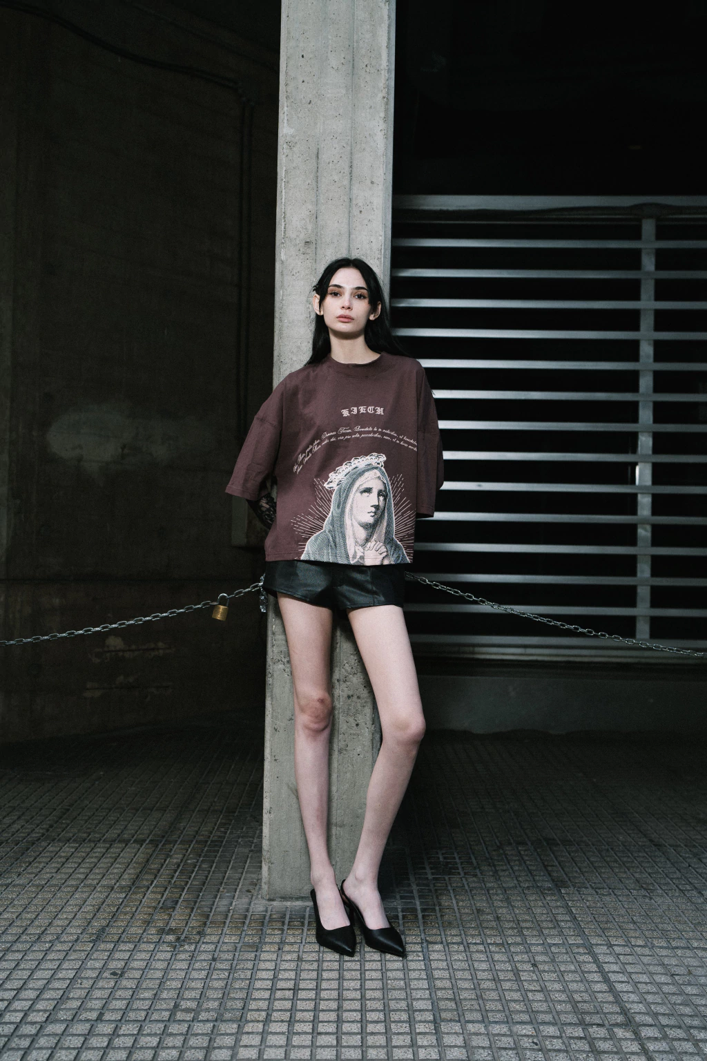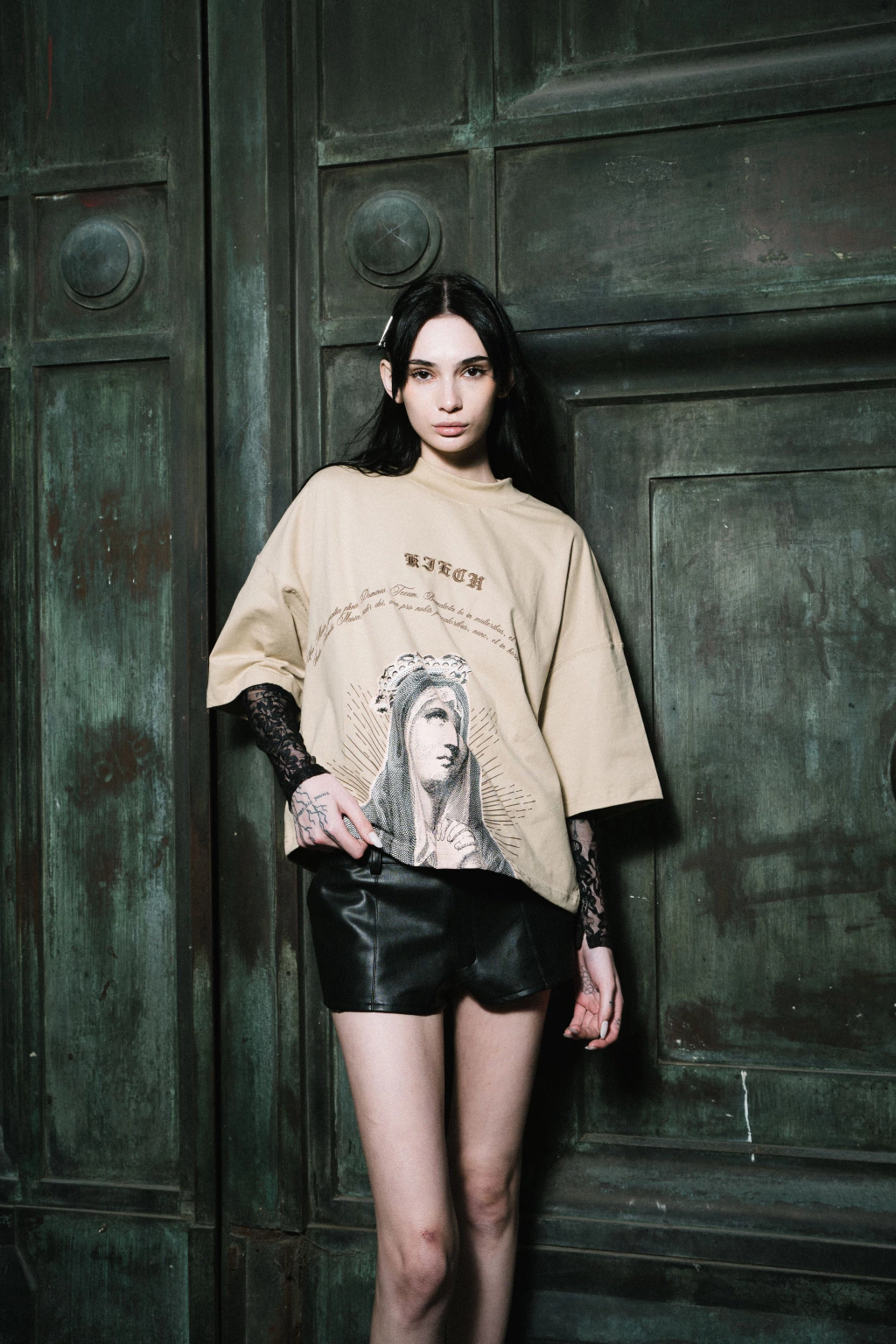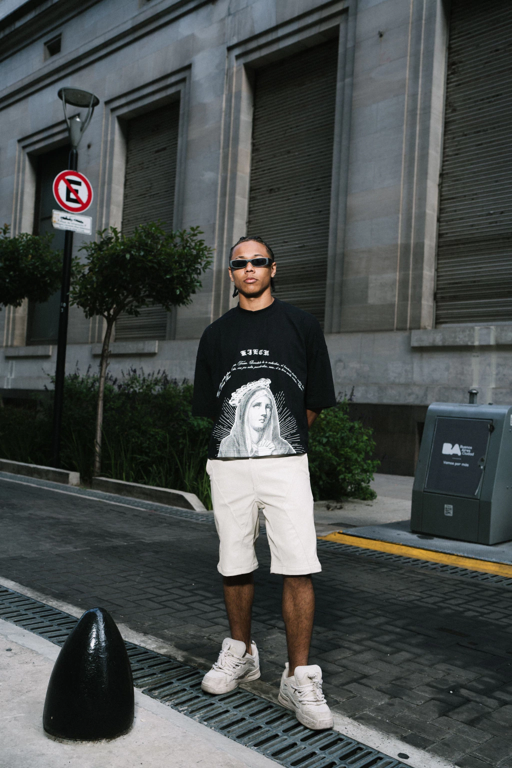 Remera Sanctus semiboxy de algodon con lycra pesado de verano con cuello de ribb alto, estampa de la virgen en el delantero y logo "KIECH" bordado.