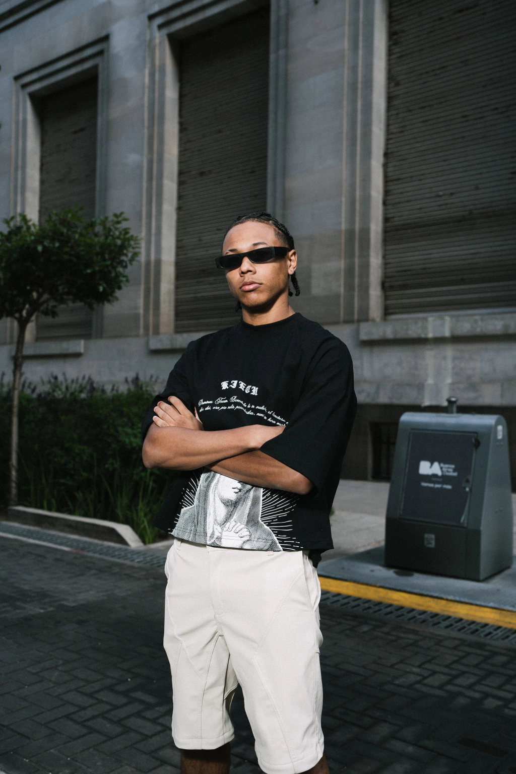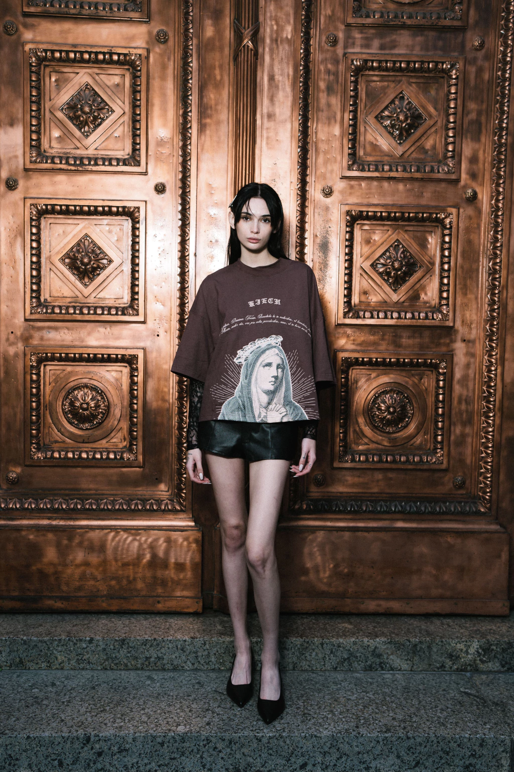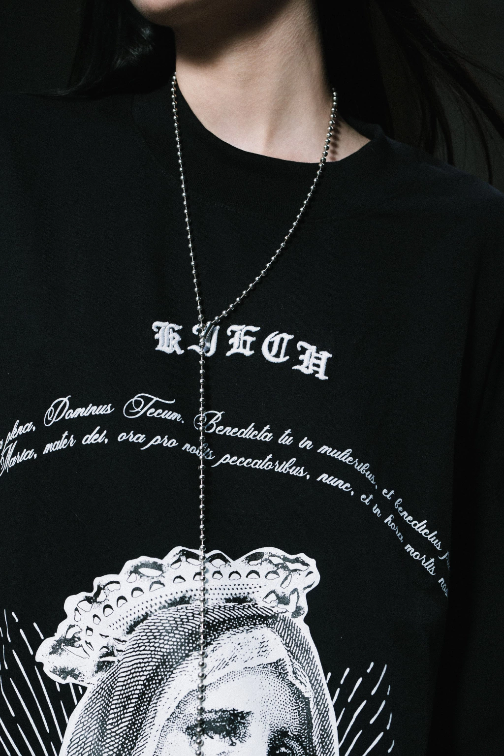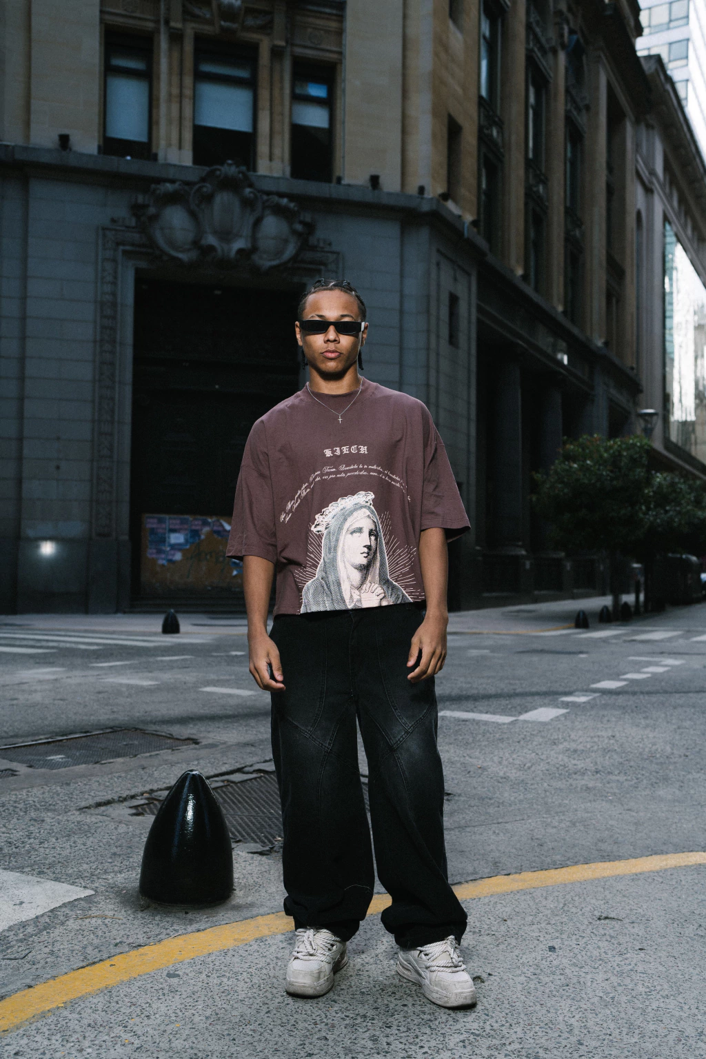 Remera Sanctus semiboxy de algodon con lycra pesado de verano con cuello de ribb alto, estampa de la virgen en el delantero y logo "KIECH" bordado.